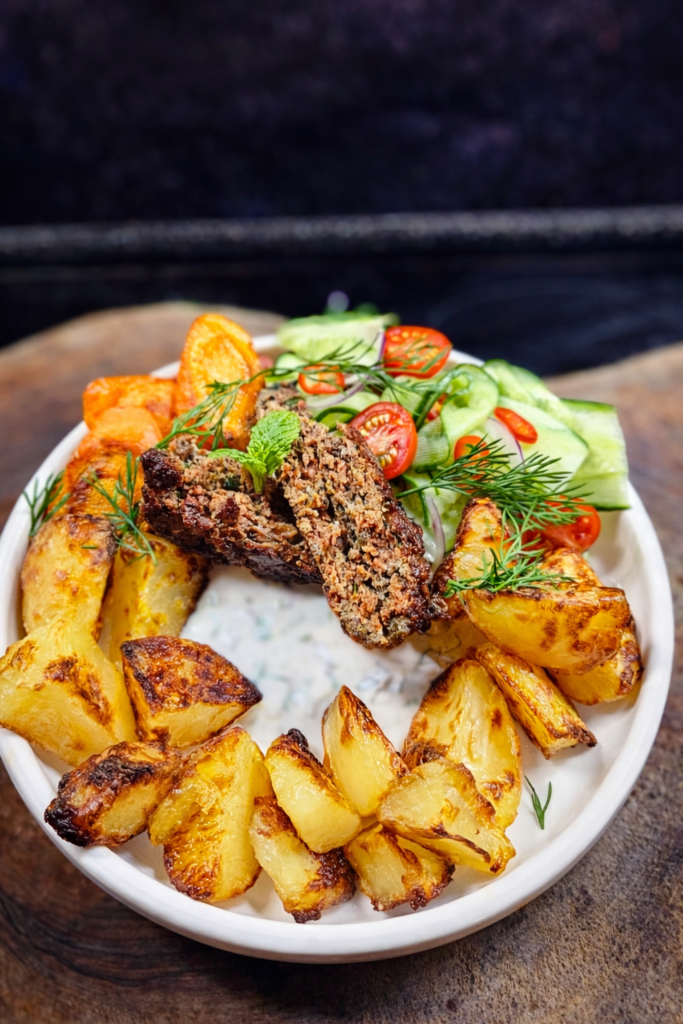 Soczysty szisz jagnięcy z miętowym sosem i świeżą sałatką z ogórka, chilli, czerwonej cebuli i cytryny. Do tego grillowana marchewka