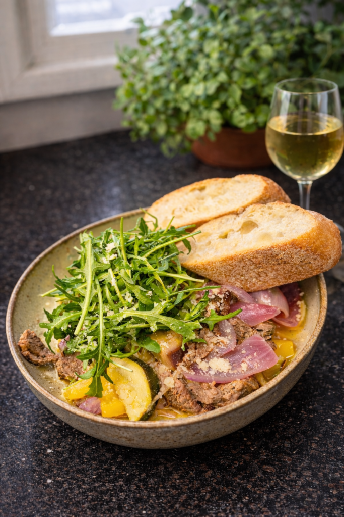 Są takie dania, które smakują jak Hiszpania nawet wtedy, gdy robisz je w domu w środku tygodnia. Wołowina duszona z warzywami w sosie z cydru jabłkowego ma w sobie wszystko, co lubię najbardziej: głębię, lekko słodko-kwaśny charakter i ten moment, kiedy kuchnia zaczyna pachnieć jak mała restauracja gdzieś na południu Europy. To danie jest sycące, ale nie ciężkie — a cydr robi tu świetną robotę, bo zamiast przytłaczać, podbija smak mięsa i dodaje świeżości.